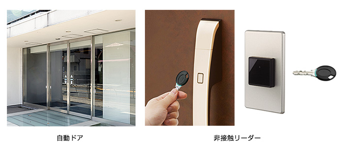 | 共用エントランスの自動ドアだけでなく、エレベーター、宅配ボックスほかさまざまなシステムとの連携が可能です。 ICキーは非接触ICタイプ、ハンズフリータイプ、FeliCaタイプがあり、形状もカード型、キー一体型、キーホルダー型などから選択可能です。 | 共用エントランスシステム VERSA Access Controller |